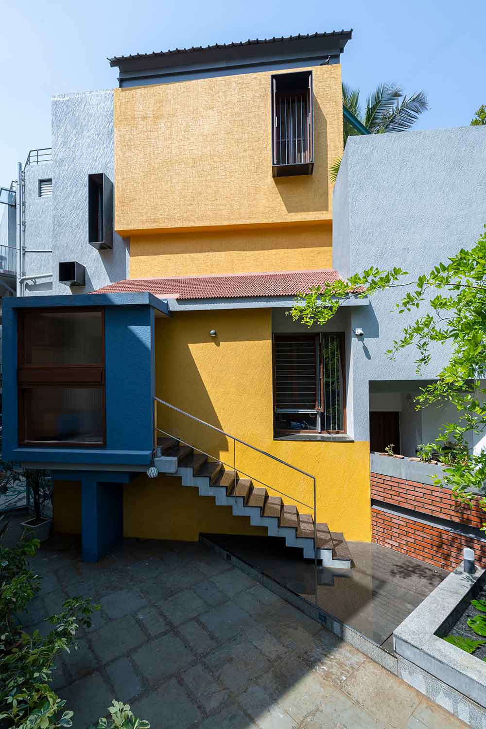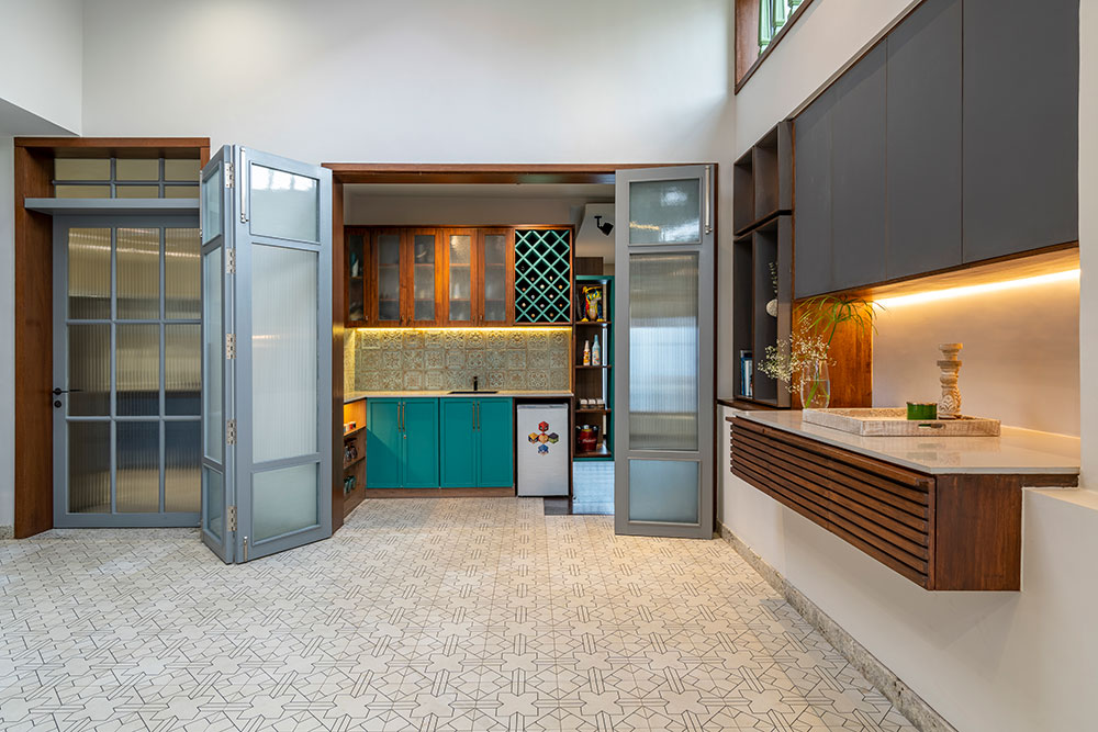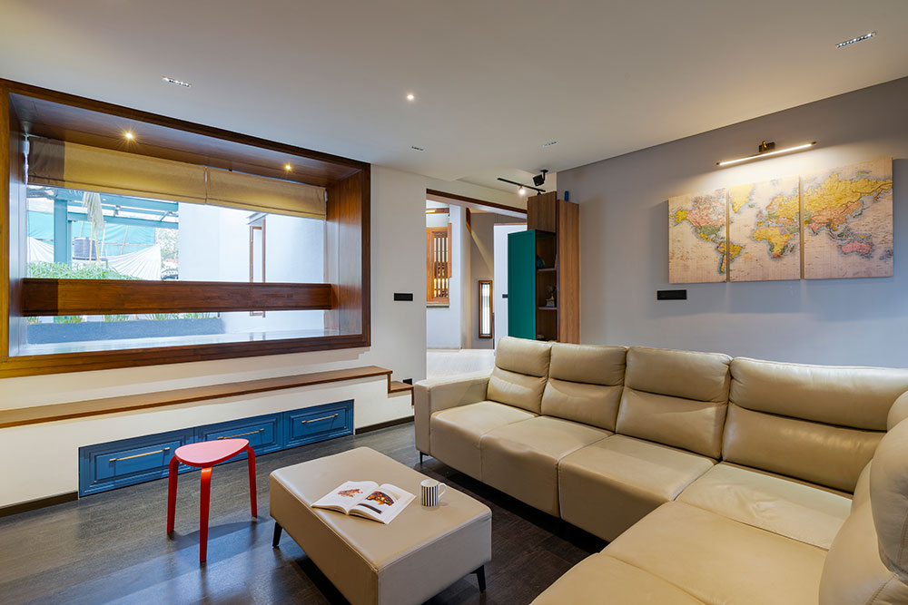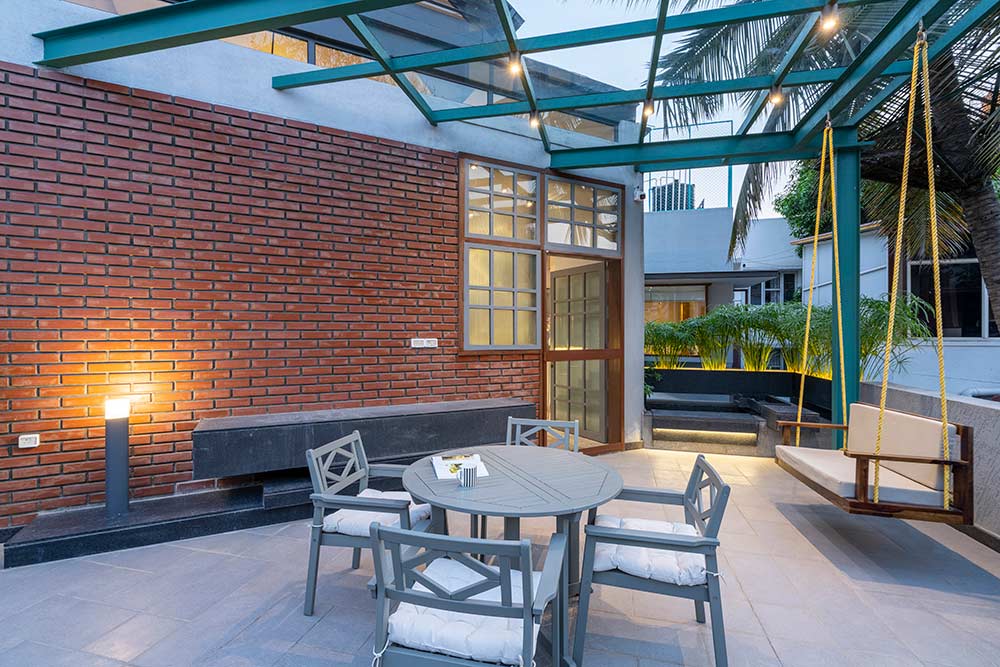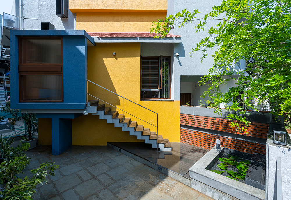 A bright colored bar area is designed as a transition space between the Multipurpose space and the Family. A large portion of the second floor has been retained as an outdoor terrace and has been intentionally placed in the front of the site so that the new volumes don’t impose upon the original elevation of the house. A water body and a swing create an intimate nook for conversations or personal introspection.