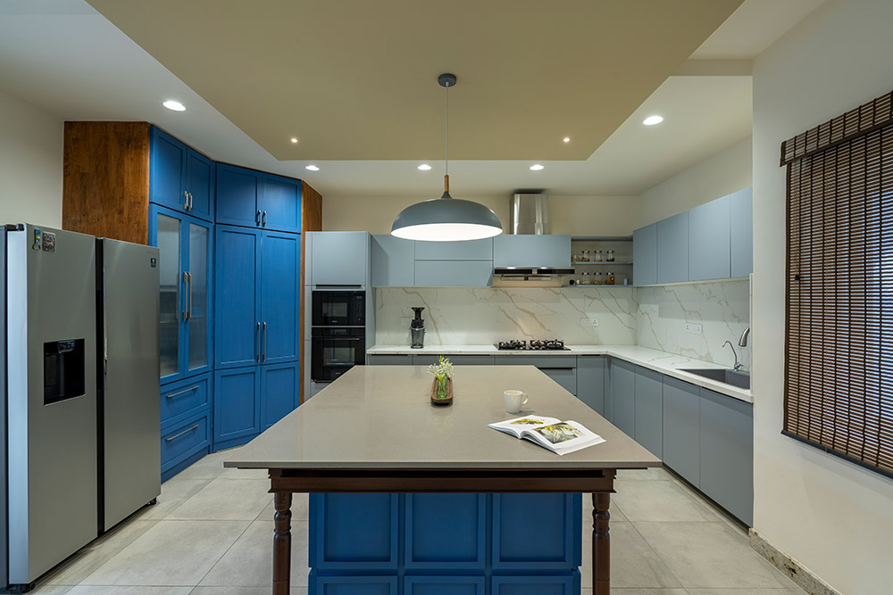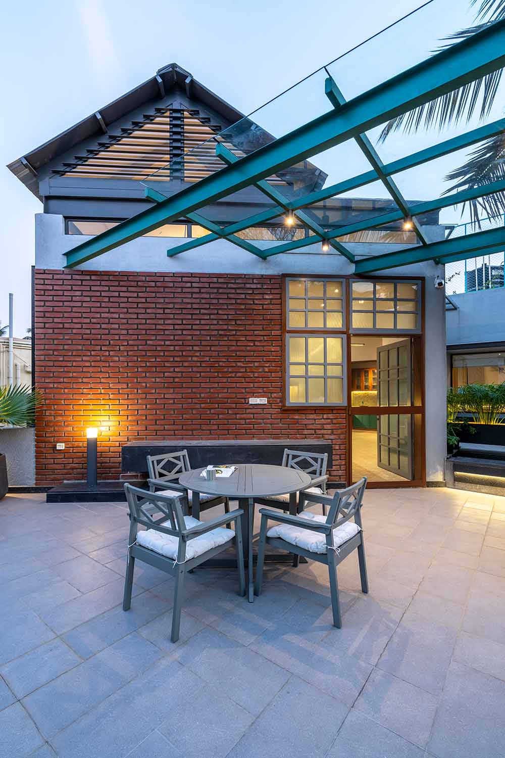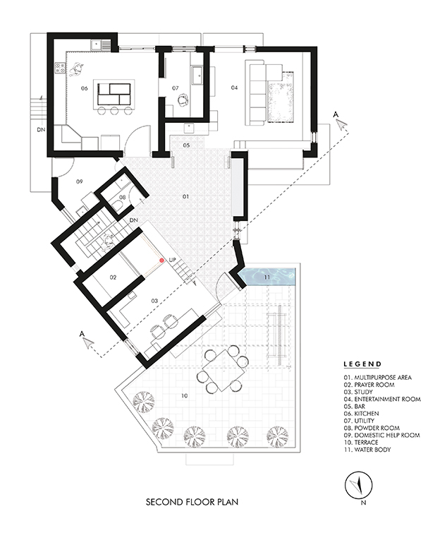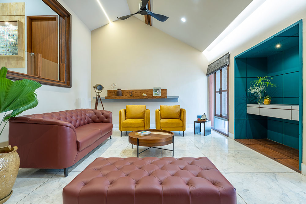 A bright colored bar area is designed as a transition space between the Multipurpose space and the Family. A large portion of the second floor has been retained as an outdoor terrace and has been intentionally placed in the front of the site so that the new volumes don’t impose upon the original elevation of the house. A water body and a swing create an intimate nook for conversations or personal introspection.