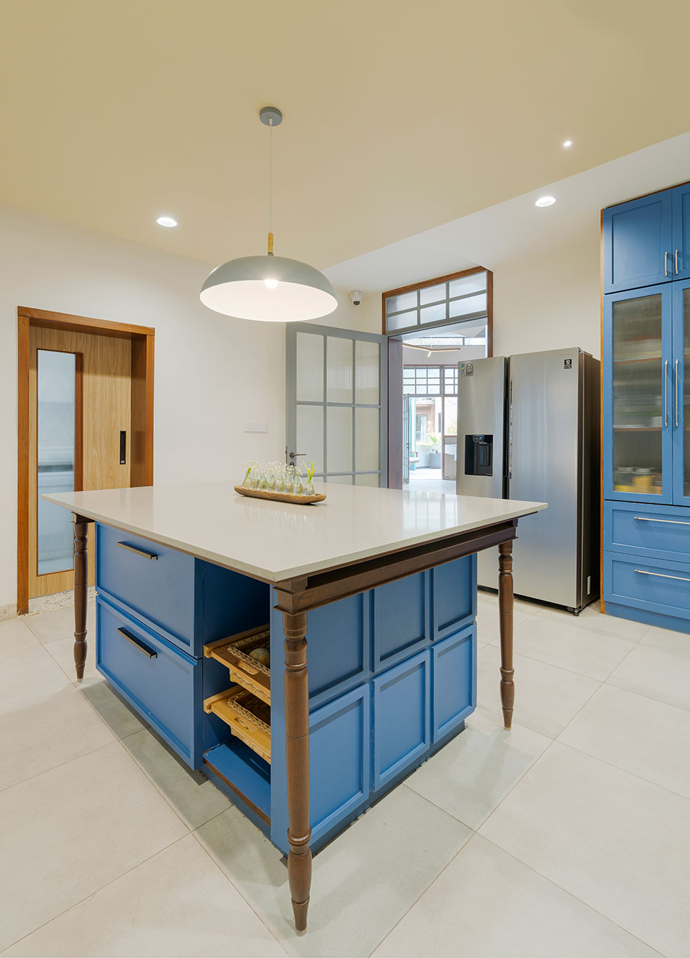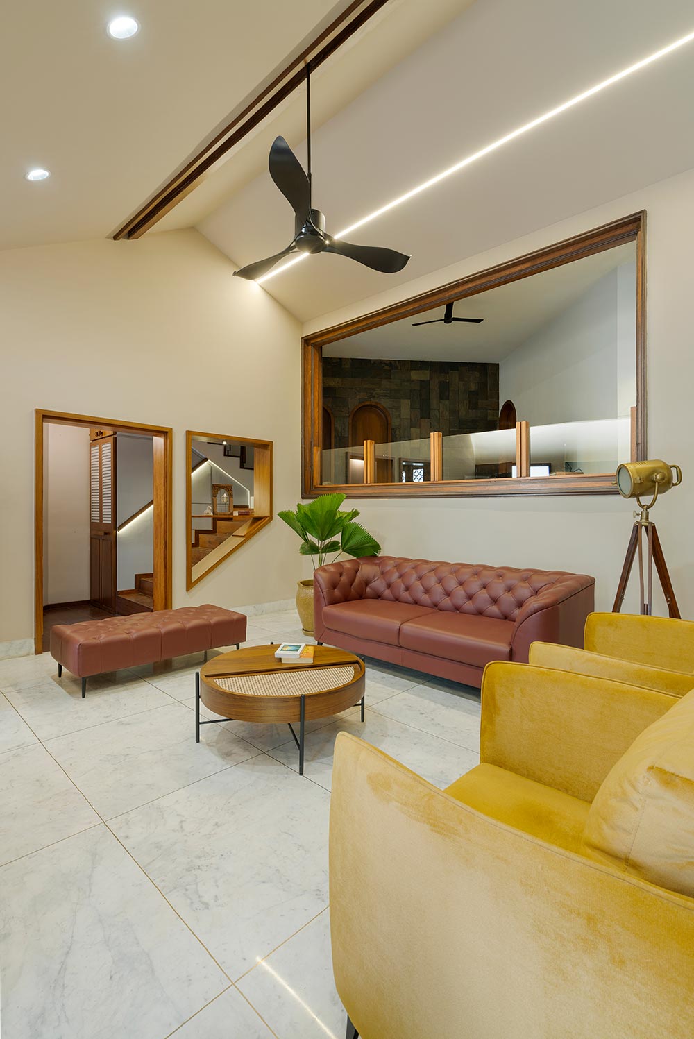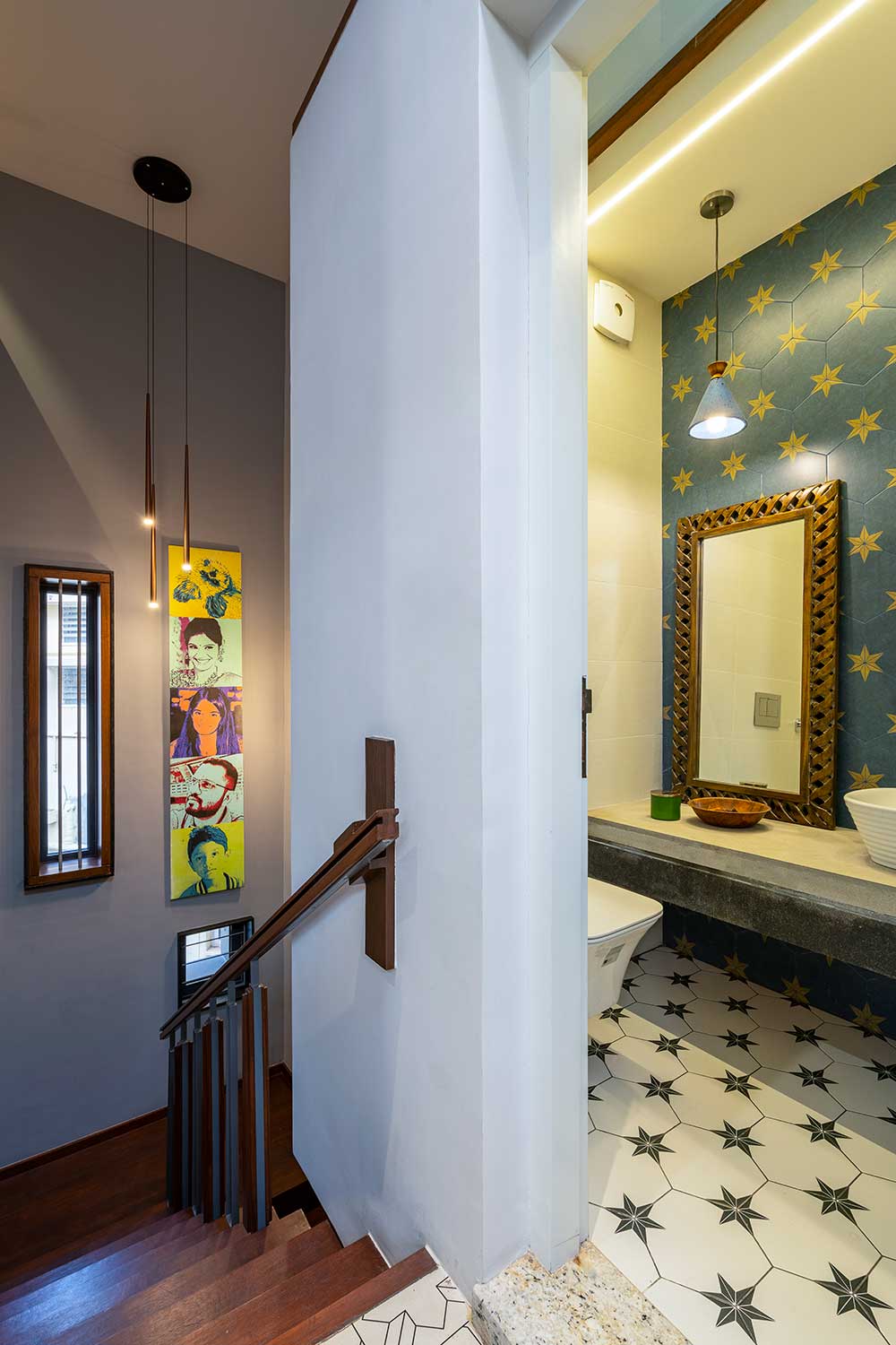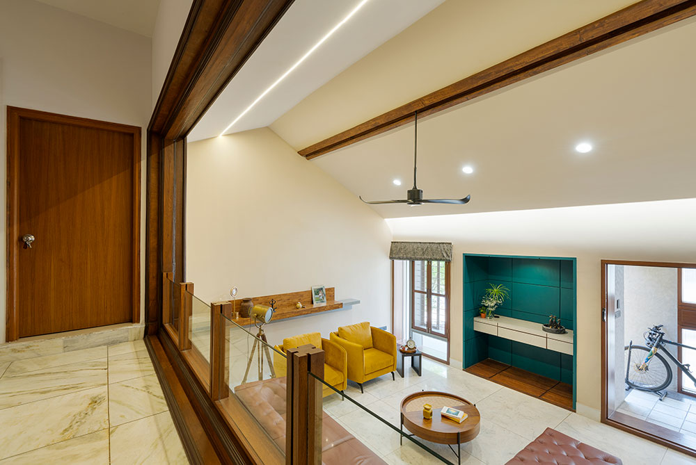 The existing staircase takes one from the living room to the newly added second floor which houses the new additions of the home. The second floor opens into an open space in the center which is flanked by the newly added spaces of the house. This floor becomes the social and entertainment center of the house.