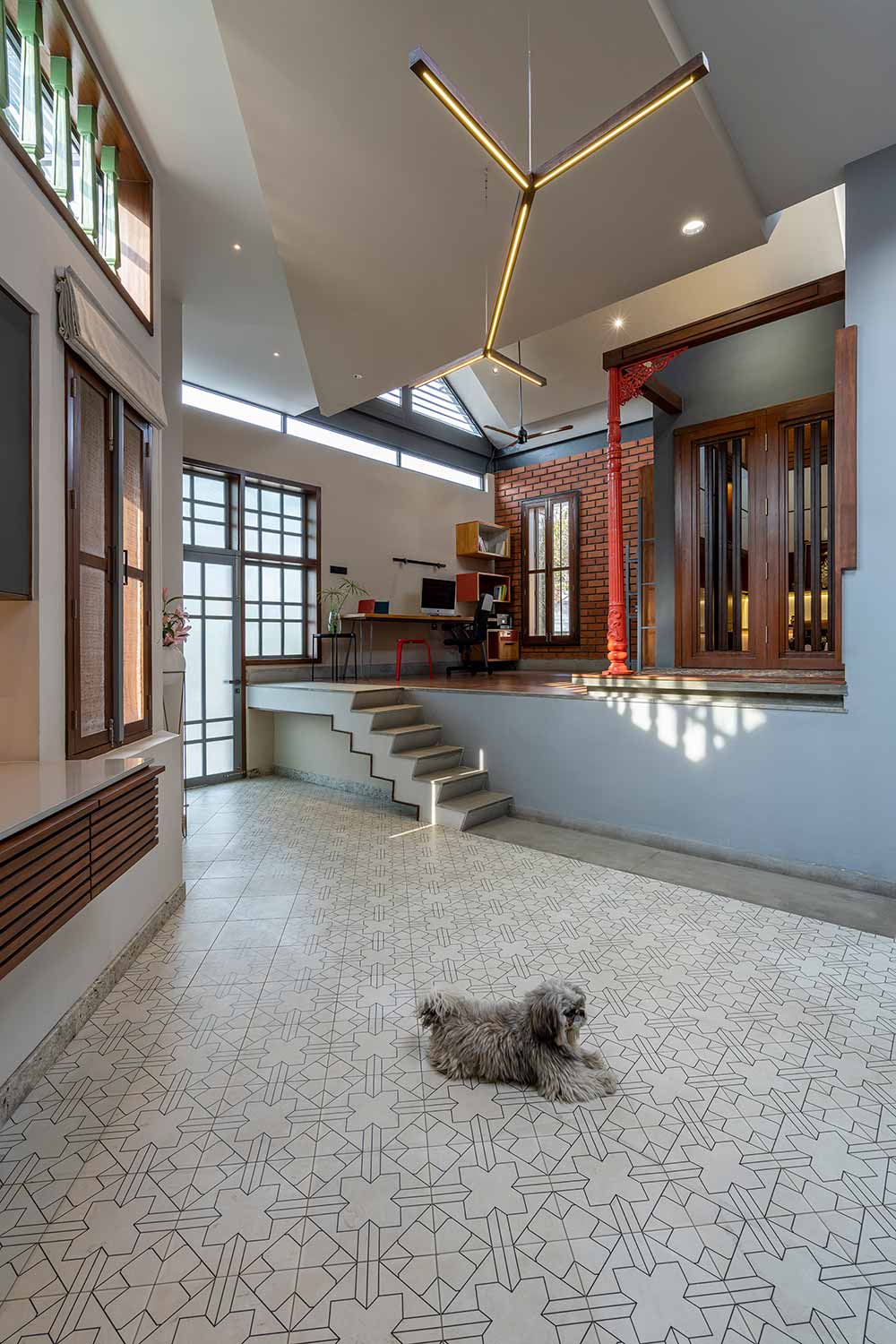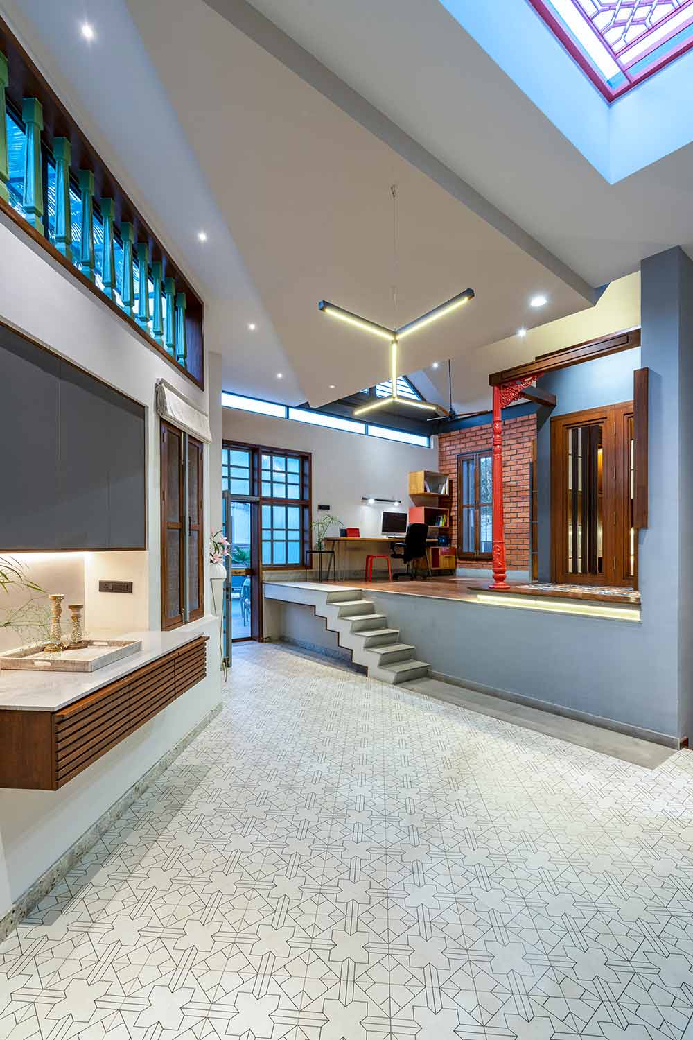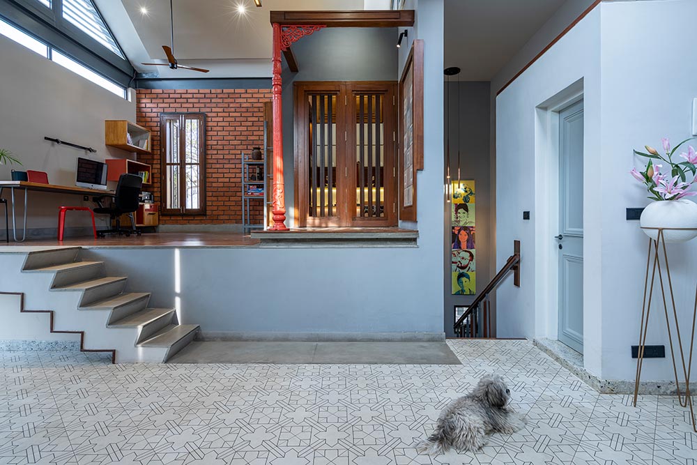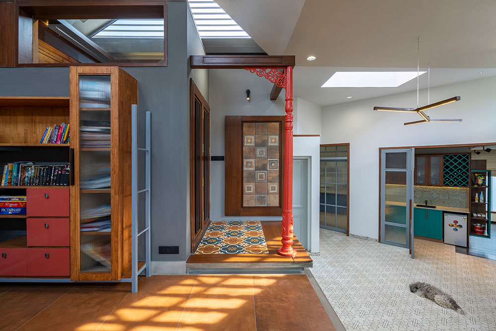 The newly added floor is divided into two levels to negotiate an existing inverted beam. A red painted metal column salvaged from an old street light and a wooden beam becomes the visual fulcrum of this floor. The raised level has a study and a prayer room which is placed to occupy the central space in the entire floor. The enclosed volume of the prayer room has been scaled down in height to make the pitch roof independent and not obstruct its visual form or the passage of light.