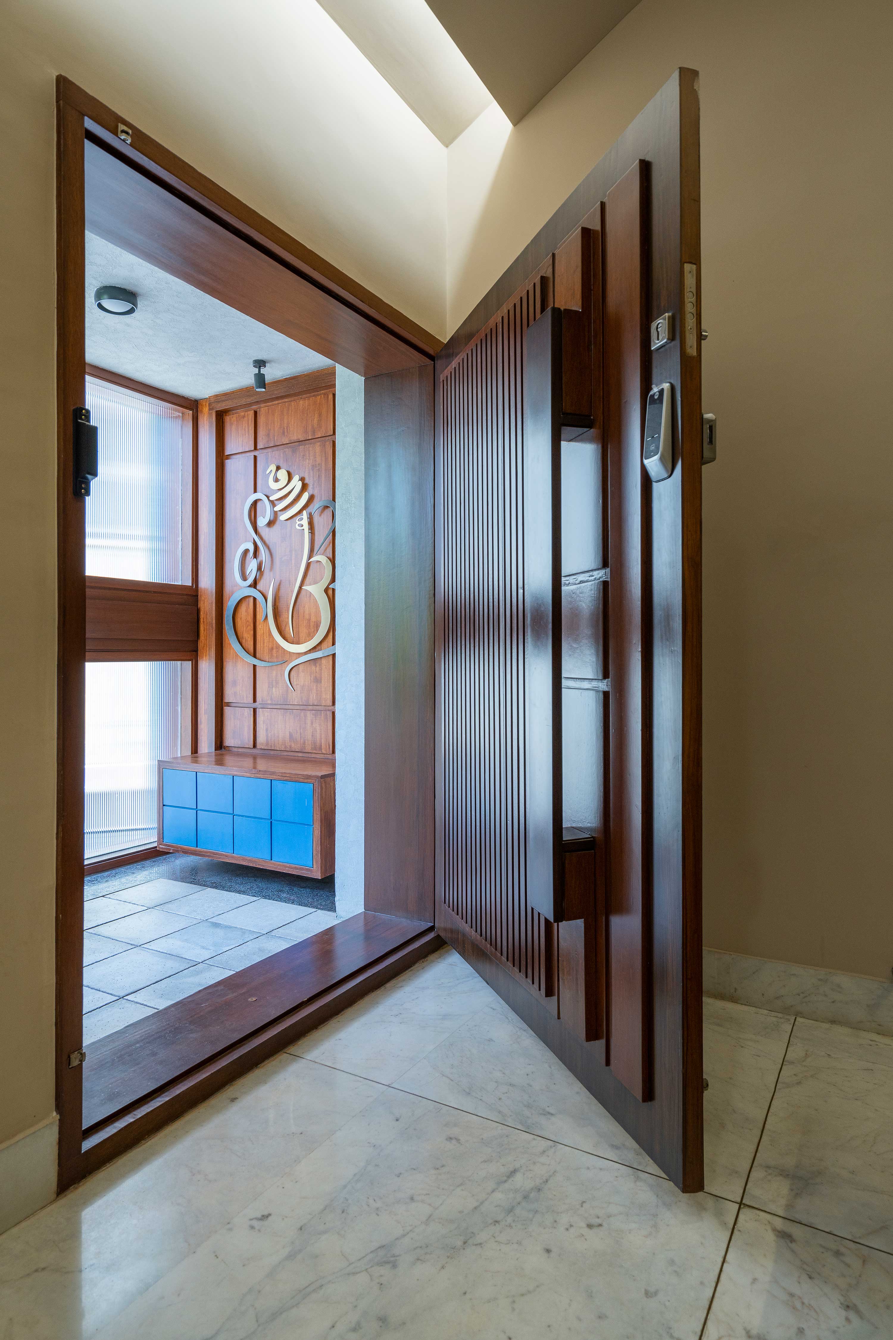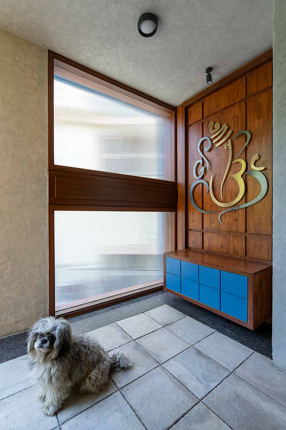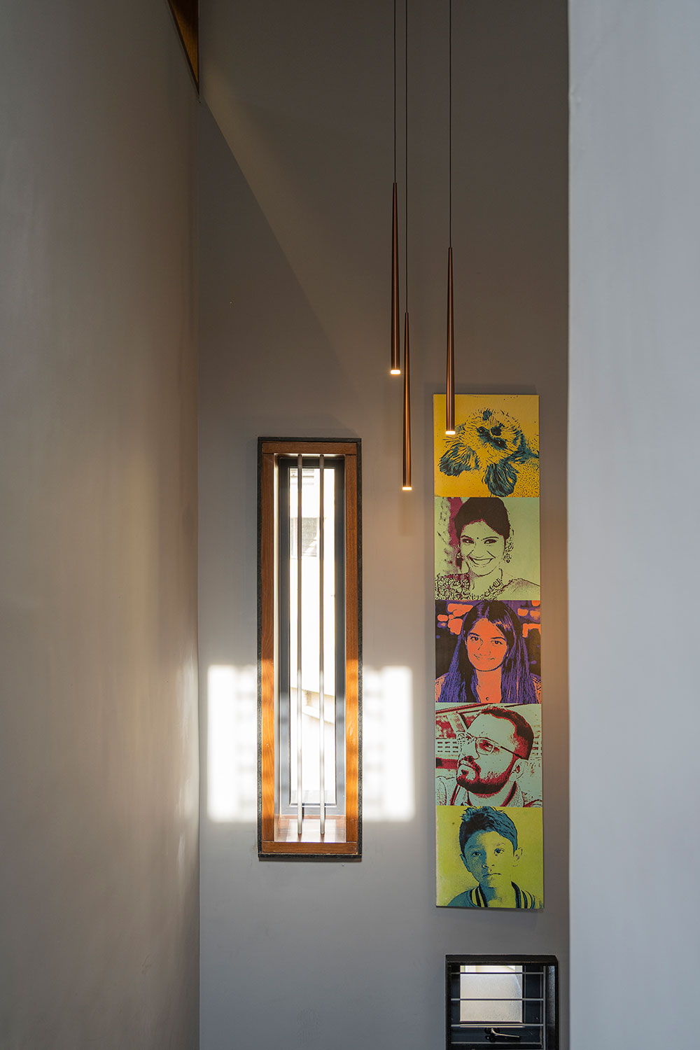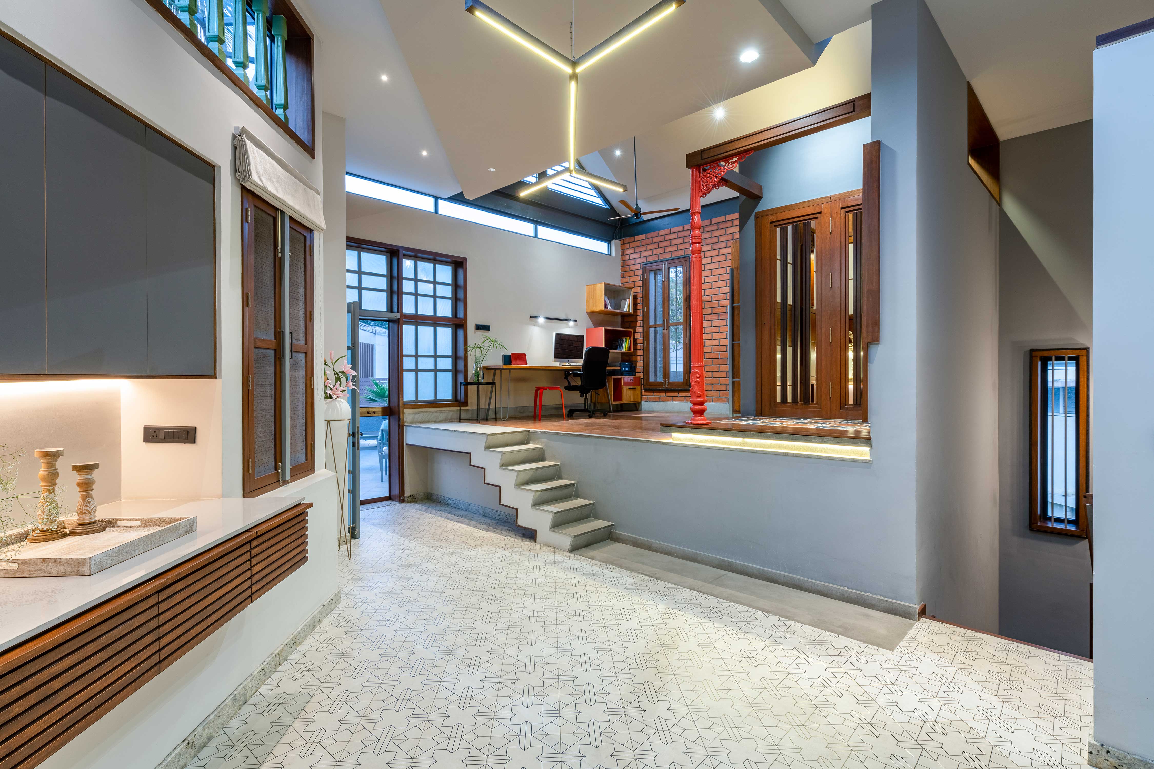 The newly added floor is divided into two levels to negotiate an existing inverted beam. A red painted metal column salvaged from an old street light and a wooden beam becomes the visual fulcrum of this floor. The raised level has a study and a prayer room which is placed to occupy the central space in the entire floor. The enclosed volume of the prayer room has been scaled down in height to make the pitch roof independent and not obstruct its visual form or the passage of light.