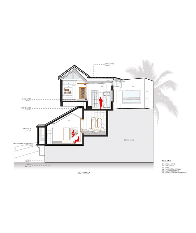 The son’s unit is entered at the ground floor mezzanine through a single flight of staircase from a car park into the formal living room. The new additions have been symbolically painted with bright colors on the exterior to give it a visual identity and differentiation from the old house. The earlier family room at the mezzanine level was now converted to a formal living room. A few steps above is the first floor with the existing bedrooms. Shuttered windows that once visually divided or opened the mezzanine to the first floor were torn down to visually unite the two levels and to expand the visual depth of experience. A folded false ceiling at the mezzanine level breaks the high volume of the formal living room and unites it with the first floor in scale.