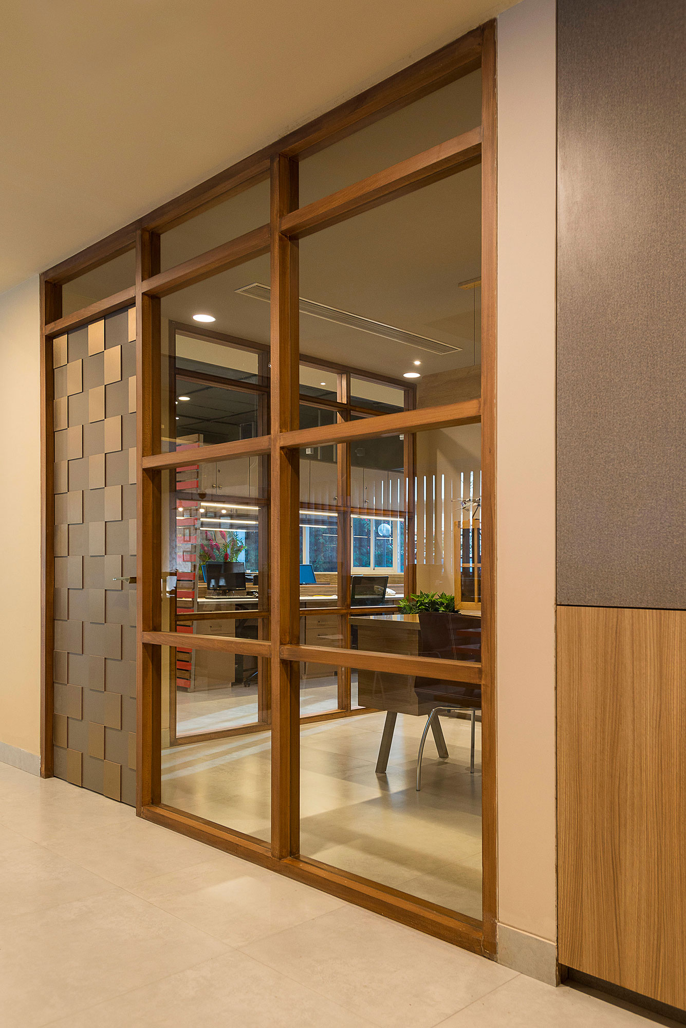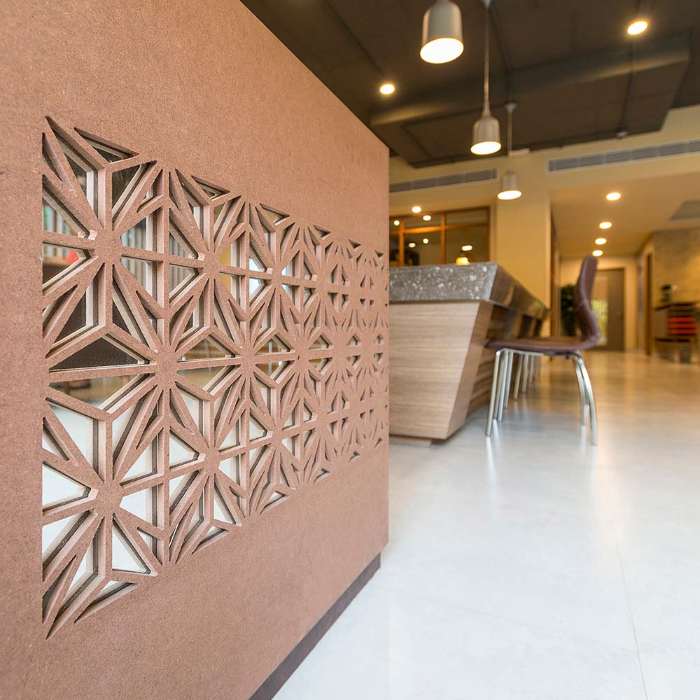The primary design challenge was in transforming a traditional office layout of a reception, lobby, work spaces, office cubicles and group discussion spaces and to create a visually connected open work space with a mix of smaller private spaces in a relatively small available area. The challenge was also to envision and design enriching spaces for a traditional workspace, so as to create memories and experiences similar to hospitality projects.