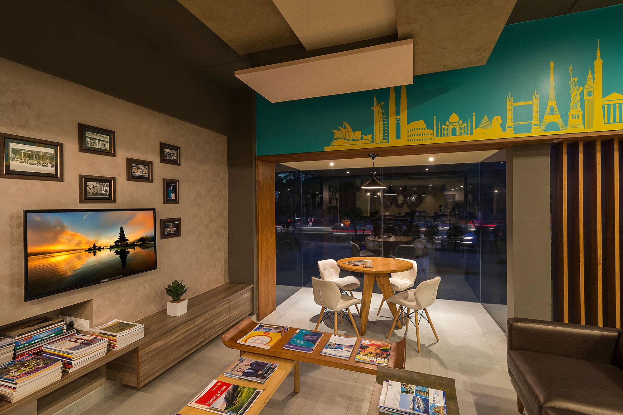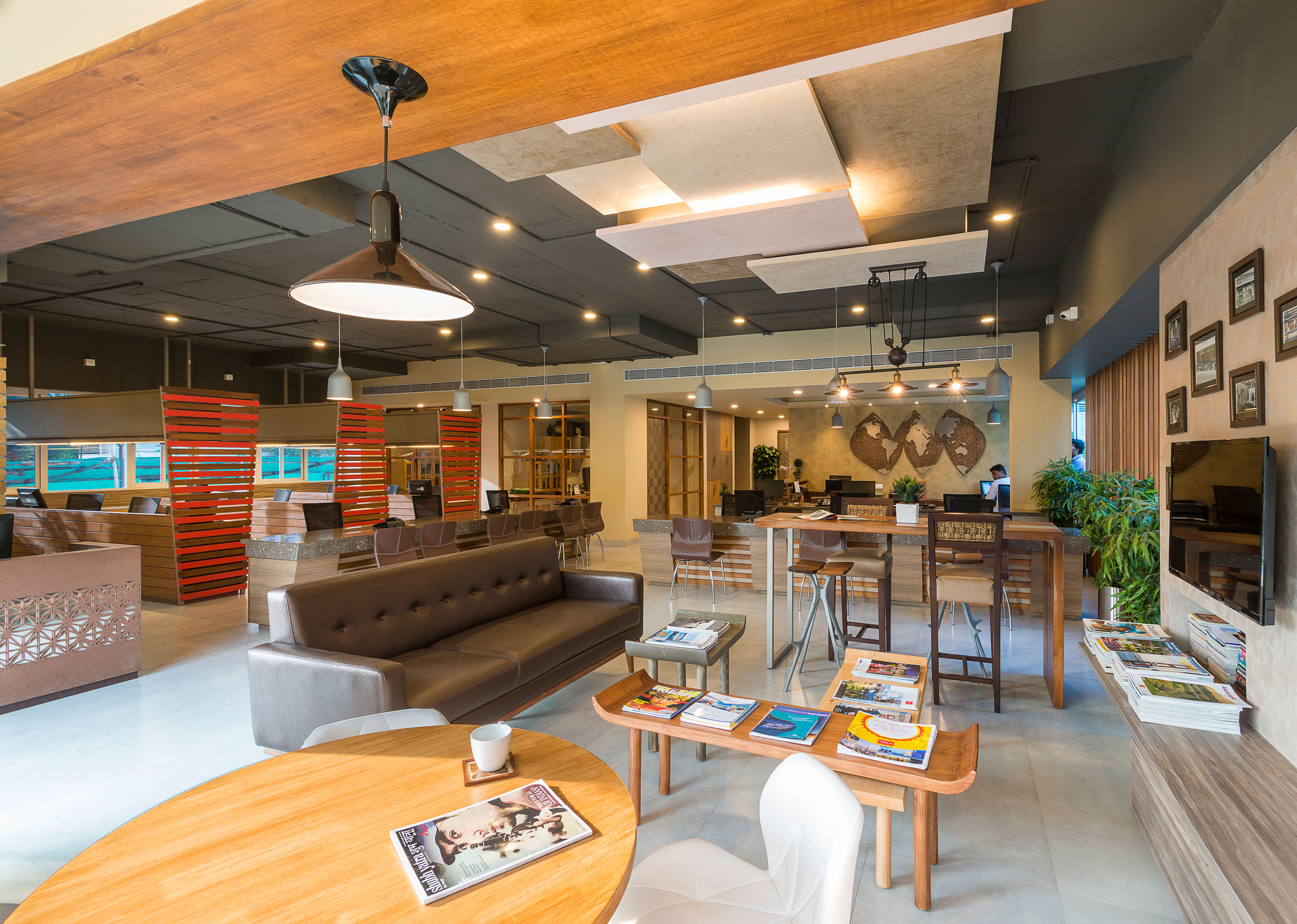 The office has been designed not just as an agency for ticketing but as a lounge where narratives of travel, experiences, exotic destinations are pieced together to create a pre travel experience. It has been designed to look at Travel as Retail where there is a focus to create an experience while you shop rather than just as a point of picking up a ticket. The travel lounge is inviting, relaxing and sophisticated yet warm.