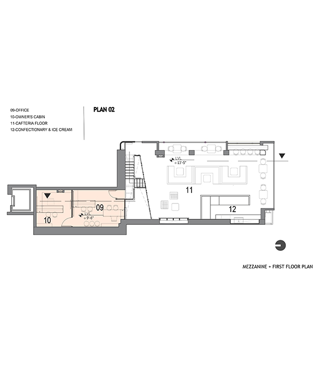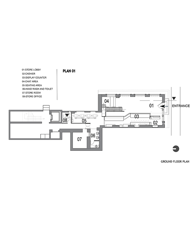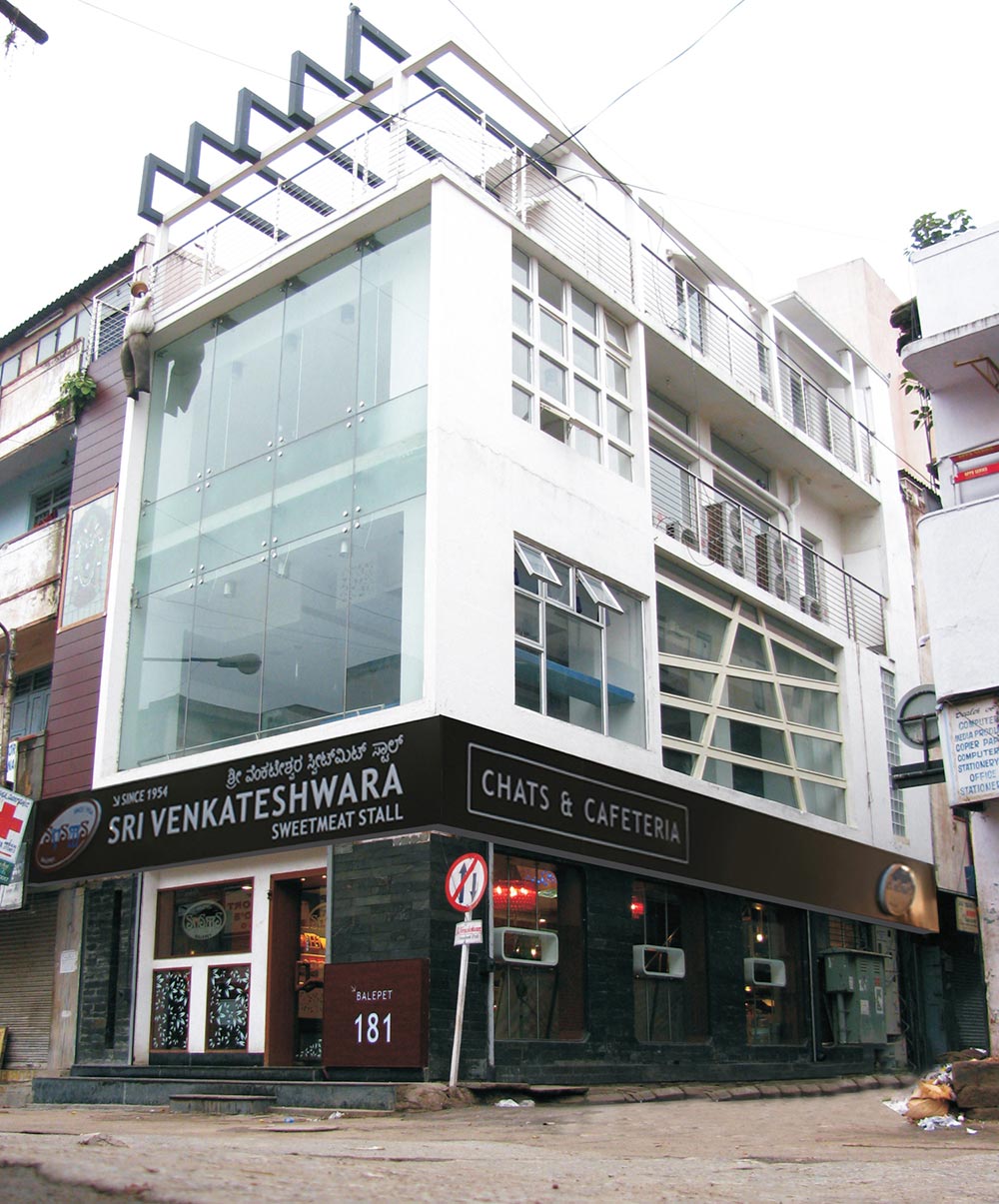 SVSMS is a family owned traditional Indian sweet store. It was first established in 1935. and located in the heart of the old market district of Balepet in Bangalore, India. The store was earlier operating from a 100sqft space in a building adjacent to our site since the 70's. The renovated space expanded to almost 4000 sqft in a building built in the 50’s. The ground floor is for the sale of sweets, first floor as a cafeteria, the second and third floor is used for packaging and storage. Because of the high ceiling heights two mezzanine floors were inserted between the ground and second floor by puncturing the first floor slab. These have been designed to be used as offices.