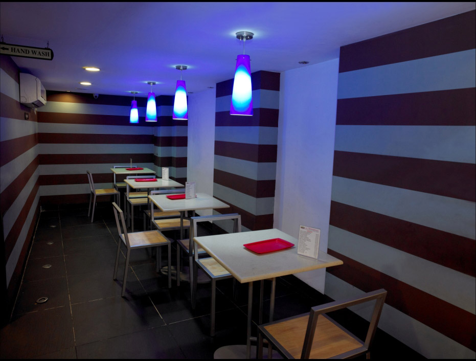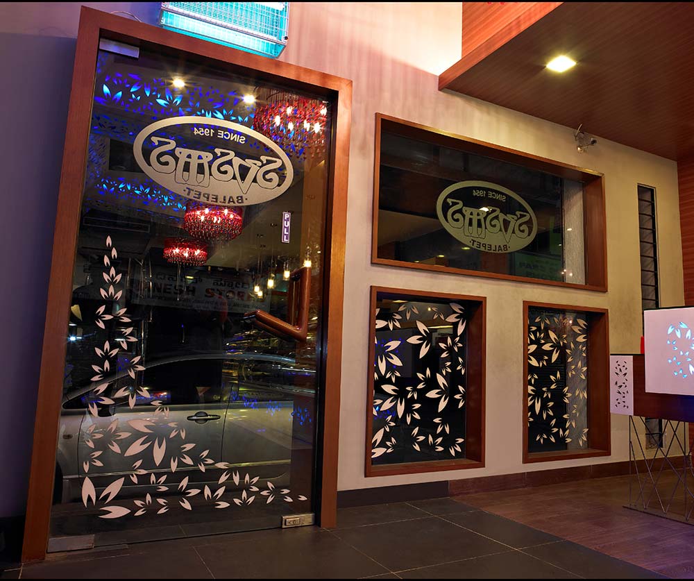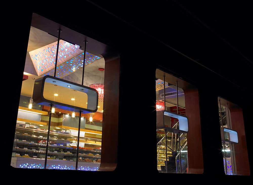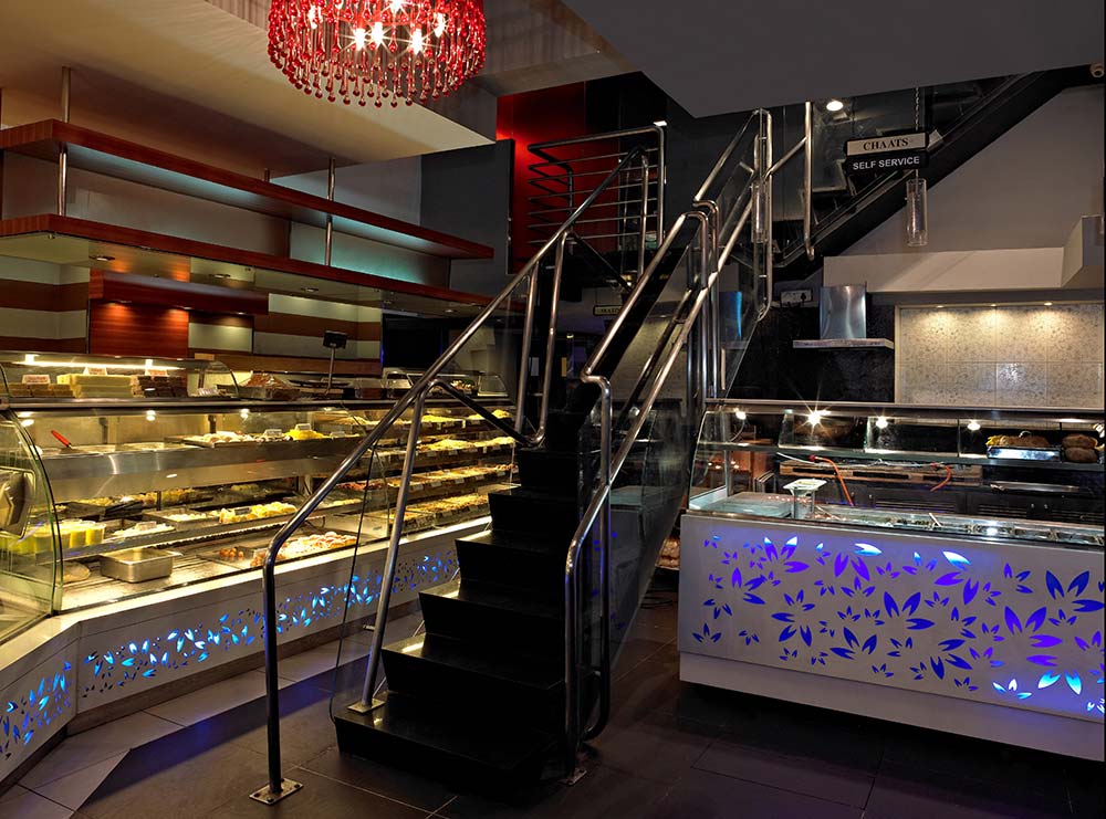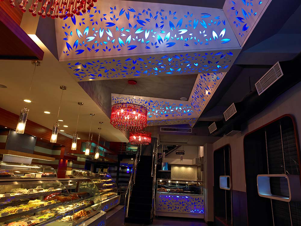 The sweet store has been in business for over 7 decades and is a landmark of sorts for sale of popular sweet called the 'Mysore Pak'. It has been attributed to the popularity of the sweet. Historically the sweet was first made in the kitchens of the Mysore Palace. Hence it was our intent to connect the history of the sweet to our ideas of design. The laser cut patterns on the MDF has been loosely based on the artwork of the Mysore Palace. The chandeliers are used to remind us of a time period when the store started and give us a sense of grandeur of where the sweet originated.