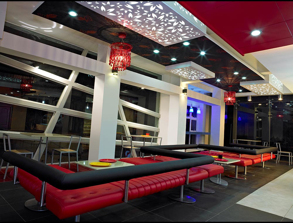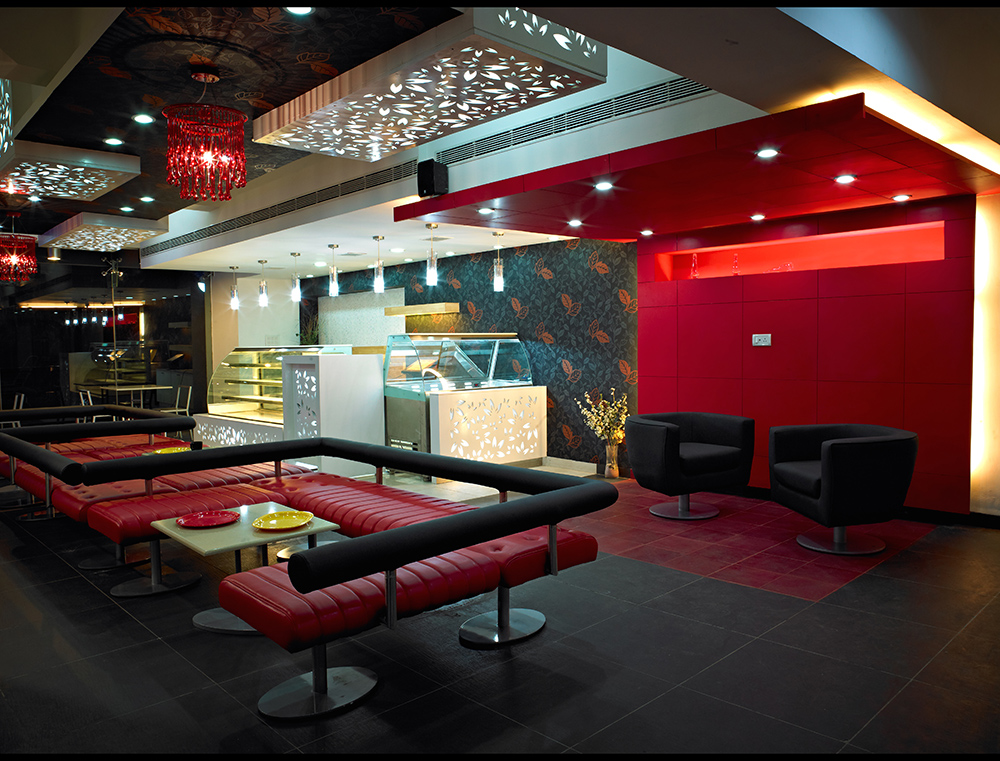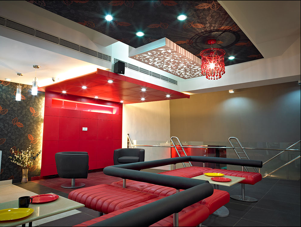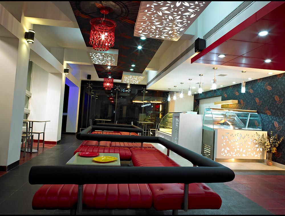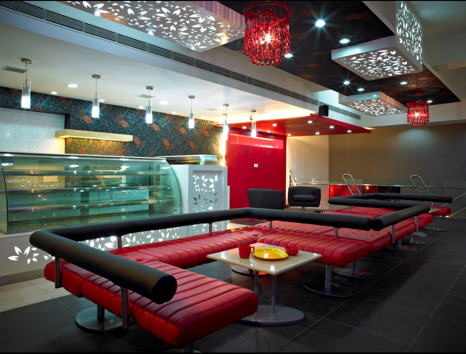 The cafeteria on the first floor is mostly kept white. The false ceiling, lighting and the front panels are all in white while wall paper has been used behind the counter and the gypsum false ceilings. The MDF panels in the false ceiling have been laser cut in the same motif as on the ground floor. The Chandeliers on the false ceiling and laser cut panels thematically connect the two floors.
