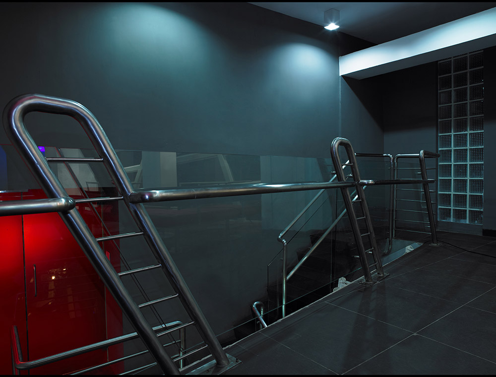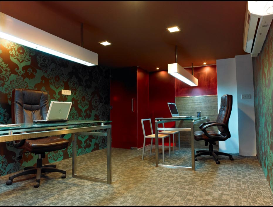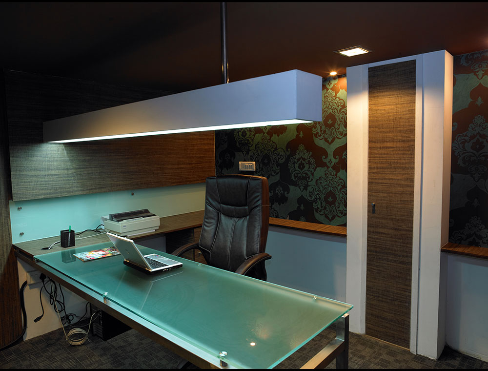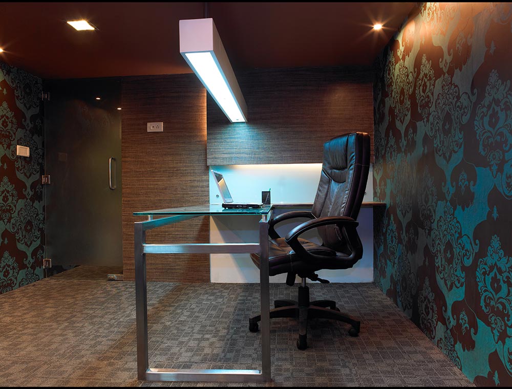 The cafeteria on the first floor is mostly kept white. The false ceiling, lighting and the front panels are all in white while wall paper has been used behind the counter and the gypsum false ceilings. The MDF panels in the false ceiling have been laser cut in the same motif as on the ground floor. The Chandeliers on the false ceiling and laser cut panels thematically connect the two floors.